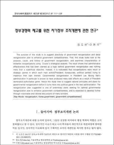 The purpose of this study is to suggest directivity of government reorganization and detail reorganization plan to enhance government competitiveness. Fist, this study looks over at the purpose, cause, and history of government reorganization, and examines characteristics of erstwhile reorganizations using Crozier"s strategical analysis. The result shows that administrative effectiveness that had been claimed as a logic behind government reorganization was nothing more than a superficial objective. lnstead, it is noticeable that reorganizations were result of strategic games in which each main actors(President, bureaucrats, political parties) trying to maximize their own interest. Governmental reorganization in President Lee Myung Bak"s administration in particular is proven to have prod..