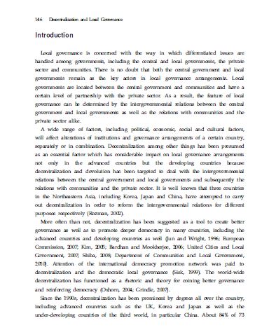 The purpose of this study is to examine the effects of decentralization reform on local democracy and good local governance in Japan in terms of local governance competitiveness. Even though Japan has established a high level of mature economy, it has been heard that an authoritarian and hierarchical model of Japan has exerted a considerable power over the society and citizens by comparatively regulating the society (Shunichi, 2003). This study is supposed to investigate whether or not decentralization reform efforts in Japan have made a contribution to reinforce democracy and better governance characterized by a high level of citizen participation and with an increased level of partnership with the private sector by reducing a level of central control and supervision.