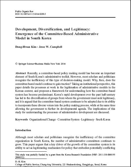 Recently, a committee-based policy making model has become an important element of South Korea’s administrative toolkit. However, most scholars and politicians recognize the inefficiency of this type of decision-making model. Why, then, does the committee-based model continue to gain traction? Taking an institutional perspective, this paper details the processes at work in the legitimation of administrative models in the Korean context, and proposes a framework for understanding how the committee-based system has become predominant. Korea’s rapid development over the past half-century has led to the diversification of groups from whom the government must seek legitimacy, and it is argued that the committee-based system continues to be adopted due to its ability to incorporate these div..