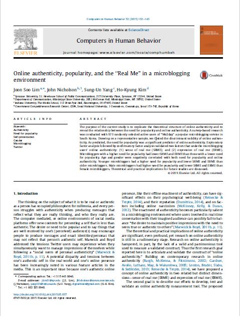 The purpose of the current study is to explicate the theoretical structure of online authenticity and to reveal the relationship between the need for popularity (NFP) and online authenticity. A survey-based research was conducted with 573 randomly selected active users of a popular microblogging service in South Korea. Drawing on a representative sample, we tested the discriminant validity of online authenticity. Exploratory factor analysis (EFA) followed by confirmatory factor analysis (CFA) validated two factors that underlie microblogging users’ online authenticity: sense of real me (SRME) and expression of real me (ERME). As hypothesized (predicted), the NFP was a significant predictor of online authenticity: Microbloggers with higher NFP had lower SRME and ERME than those with lowe..
