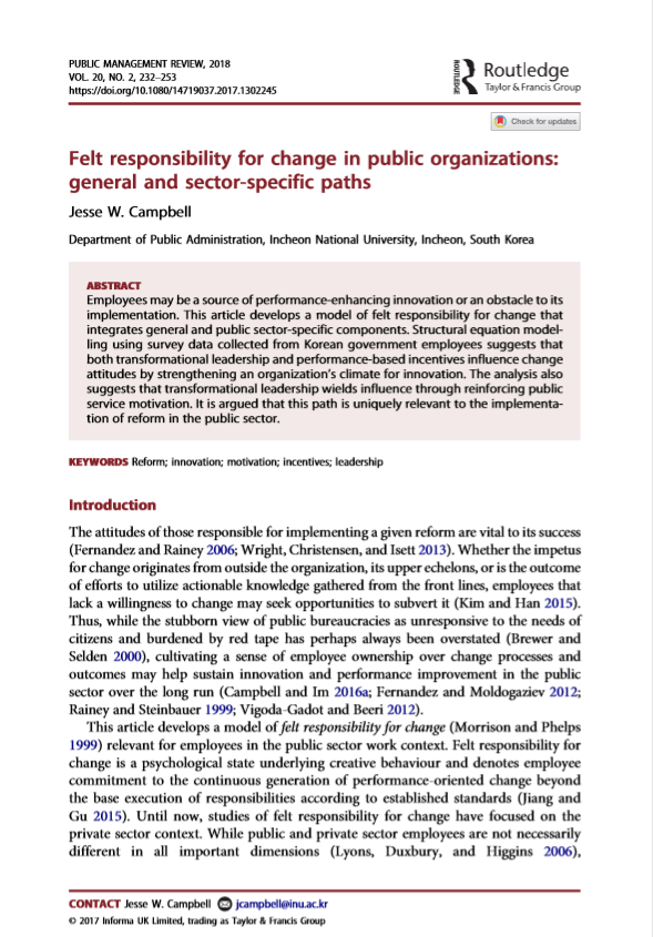 Employees may be a source of performance-enhancing innovation or an obstacle to its implementation. This article develops a model of felt responsibility for change that integrates general and public sector-specific components. Structural equation modelling using survey data collected from Korean government employees suggests that both transformational leadership and performance-based incentives influence change attitudes by strengthening an organization’s climate for innovation. The analysis also suggests that transformational leadership wields influence through reinforcing public service motivation. It is argued that this path is uniquely relevant to the implementation of reform in the public sector.