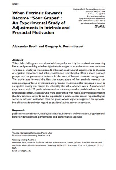 The use of performance pay in public organizations is contentious partly because it can crowd out the intrinsic motivation associated with public service. However, not all public employees are service oriented and sensitivity to extrinsic rewards varies between them. Exchange ideology measures the strength of an individual’s belief that work effort should be proportional to treatment by the organization. We argue that this psychological trait conditions the relationship between performance pay and pay satisfaction. An analysis of survey data collected from Korean government employees shows that performance pay is positively related to pay satisfaction in the average case, and second that this relationship is stronger for employees with higher levels of exchange ideology. Monte Carlo sim..