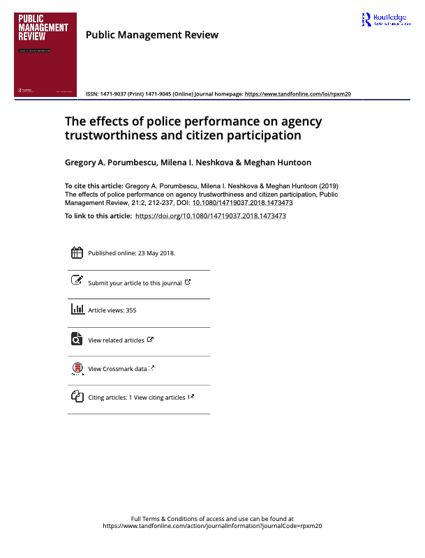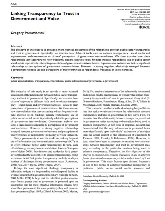 AbstractThe objective of this study is to provide a more nuanced assessment of the relationship between public sector transparency and trust in government. Specifically, we examine how different tools used to enhance transparency—social media and e-government websites—relate to citizens’ perceptions of government trustworthiness. We then examine how these relationships vary according to how frequently citizens exercise voice. Findings indicate respondents’ use of public sector social media is positively related to perceptions of government trustworthiness. E-government website use lacks a significant relationship to perceptions of government trustworthiness. However, a strong negative relationship emerged between e-government website use and perceptions of trustworthiness as responde..