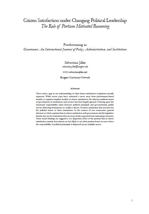 AbstractThere exists a gap in our understanding of what citizen satisfaction evaluations actually represent. While recent years have witnessed a move away from performance-based models to cognitive-implicit models of citizen satisfaction, the inherent political nature of government, its institutions and services has been largely ignored. Drawing upon the functional responsibility chain between political principals and governmental, public service delivering institutions, we outline a theory of citizen satisfaction that accounts for the political nature of these institutions. In the context of two consecutive general elections we find a partisan bias in citizen satisfaction with government and the legislative branch, but not for institutions that are more clearly separated from national ..