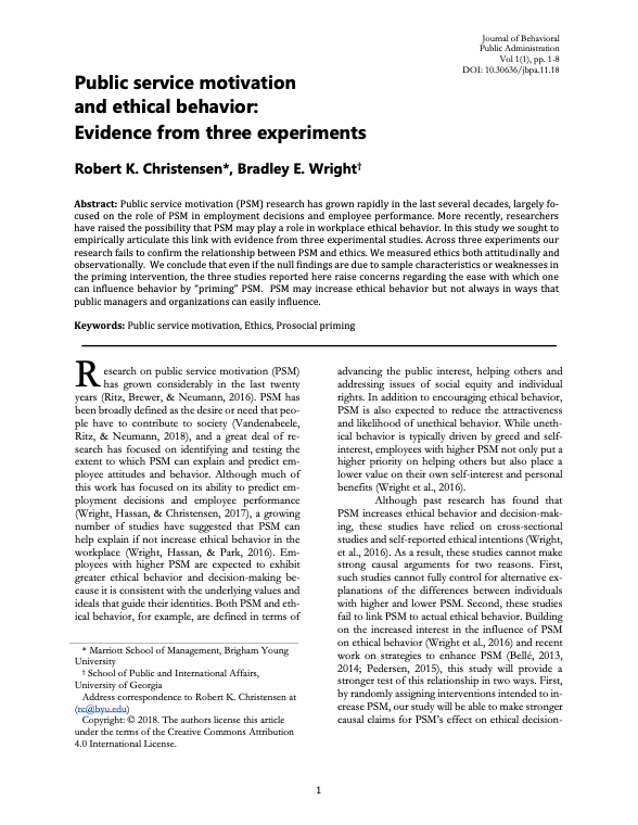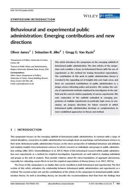 AbstractThis article introduces the symposium on the emerging subfield of behavioural public administration. The nine articles of the symposium each combine a focus on behavioural theory with the use of experiments as the method for testing theoretical expectations. The contribution of this work to public administration theory is revealed in the expanding set of insights into core topic areas, and there are associated contributions to public administration as a design science informing policy and practice. We analyse the variety of experimental methods employed by investigators in the subfield and the current relative popularity of survey experiments. We note maturation of the subfield embodied in emerging programmes of multiple experiments on particular topic areas. In conclusion, we pr..