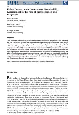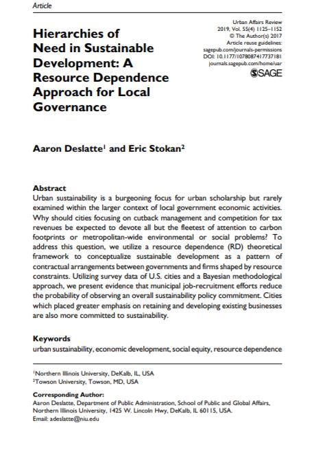 AbstractUrban sustainability is a burgeoning focus for urban scholarship but rarely examined within the larger context of local government economic activities. Why should cities focusing on cutback management and competition for tax revenues be expected to devote all but the fleetest of attention to carbon footprints or metropolitan-wide environmental or social problems? To address this question, we utilize a resource dependence (RD) theoretical framework to conceptualize sustainable development as a pattern of contractual arrangements between governments and firms shaped by resource constraints. Utilizing survey data of U.S. cities and a Bayesian methodological approach, we present evidence that municipal job-recruitment efforts reduce the probability of observing an overall sustainabil..