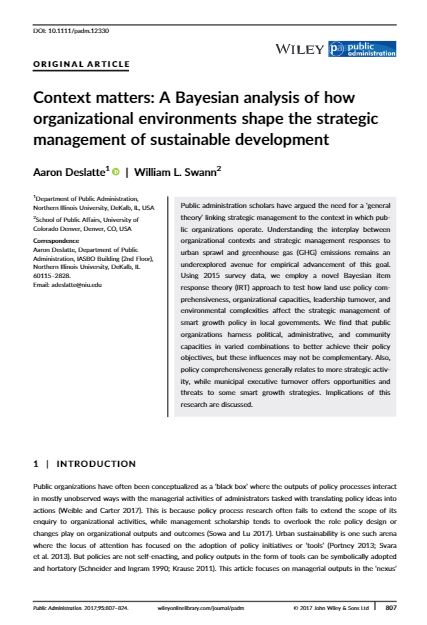 AbstractPublic administration scholars have argued the need for a ‘general theory’ linking strategic management to the context in which public organizations operate. Understanding the interplay between organizational contexts and strategic management responses to urban sprawl and greenhouse gas (GHG) emissions remains an underexplored avenue for empirical advancement of this goal. Using 2015 survey data, we employ a novel Bayesian item response theory (IRT) approach to test how land use policy comprehensiveness, organizational capacities, leadership turnover, and environmental complexities affect the strategic management of smart growth policy in local governments. We find that public organizations harness political, administrative, and community capacities in varied combinations to be..