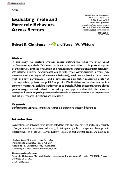 In this study, we explore whether sector distinguishes what we know about performance appraisals. We were particularly interested in two important aspects of the appraisal process: evaluation of inrole/task and extrarole/citizenship behaviors. We utilized a mixed experimental design with three within-subjects factors (task behavior and two types of extrarole behavior), each manipulated at two levels (high and low performance), and a between-subjects factor measuring sector of the respondent (private and public/nonprofit). We find that sector does matter in a common managerial task like performance appraisals. Public sector managers placed greater weight on task behaviors in making their appraisals than did private sector managers. Results regarding sector and extrarole behaviors were mix..