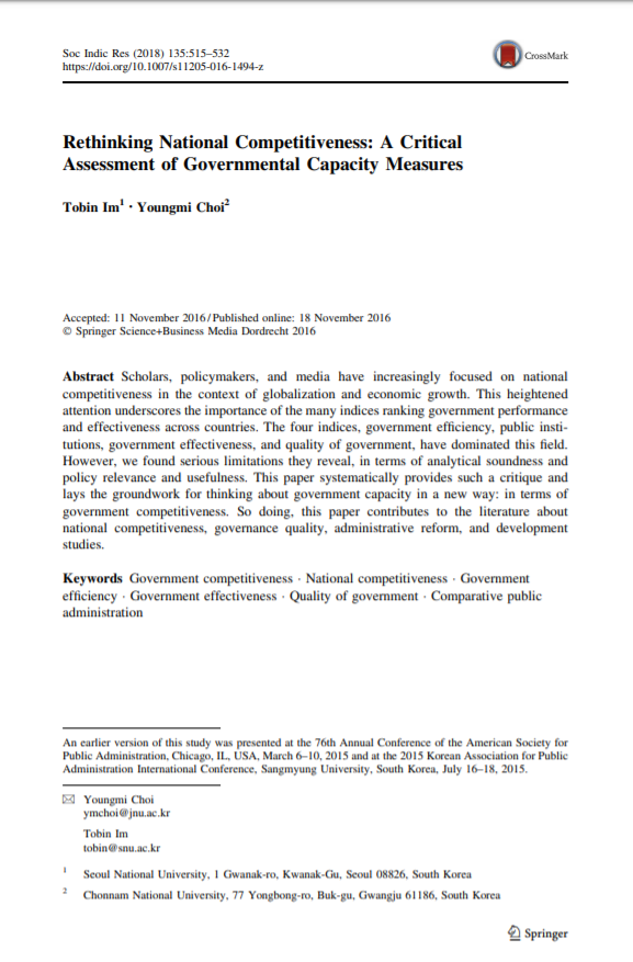 This paper criticizes various indexes of national competitiveness that are widely used these days and discusses the necessity of a new concept that represents the institutional capacity of a government of a country whose natural and historical conditions are different from others, National competitiveness indexes, such as IMD`s and WEF`s, for example, lack rigorous theoretical foundations and contain a lot of validity and reliability problems. Based on the arguments concerning the inherent defects of these concepts, this study proposes a new concept of Government Competitiveness. The new concept, incorporating systems theory, Maslow`s hierarchical needs theory, and Fukuyama`s state function theory as three basic foundational pillars, proposes the core components of a country`s competitiv..
